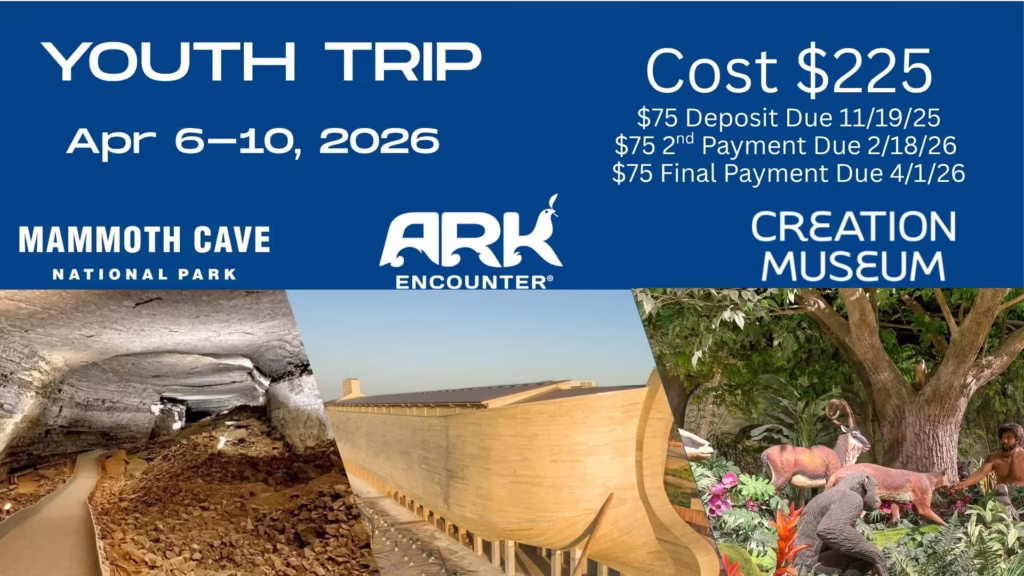 Youth are going to the Creation Museum, the Ark and Mammoth Cave on April 6-10, 2025. Cost for the trip is $225. Food is not included in the cost of the trip. Please bring at least $125 extra for food. $75 payments due 11-19, 2-18 and 4-1.